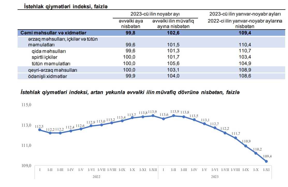 Azərbaycanda illik inflyasiyanın tempi 3,9 faizdən 2,6 faizə düşüb.2023-cü ilin yanvar-noyabr aylarında istehlak qiymətləri indeksi (inflyasiya göstəricisi) 2022-ci ilin yanvar-noyabr aylarına nisbətən 9,4 faiz, o cümlədən ərzaq məhsulları, içkilər və tütün məmulatları üzrə 10,4 faiz, qeyri-ərzaq məhsulları üzrə 8,9 faiz, əhaliyə göstərilmiş ödənişli xidmətlər üzrə 8,6 faiz artıb.
