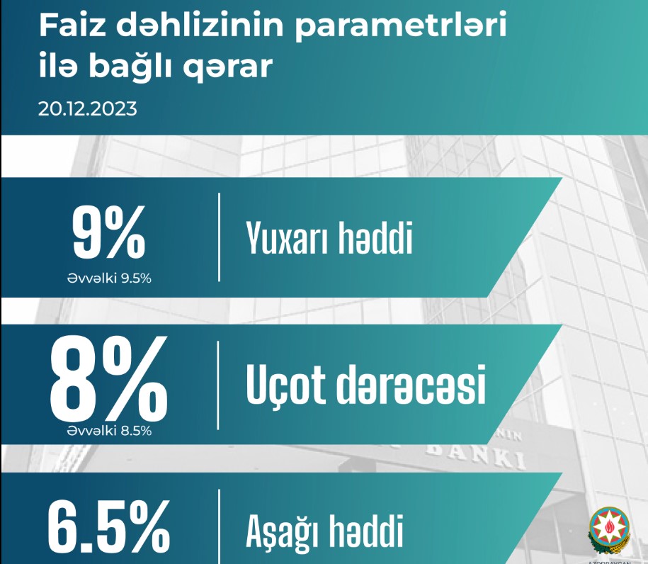 Xatırladaq ki, 01 noyabr 2023-cü il tarixində də Azərbaycan Respublikası Mərkəzi Bankının İdarə Heyətinin qərarı ilə uçot dərəcəsi 9%-dən 8.5%-ə, faiz dəhlizinin aşağı həddi 7.5%-dən 7%-ə, faiz dəhlizinin yuxarı həddi isə 10%-dən 9.5%-ə endirilmişdi.