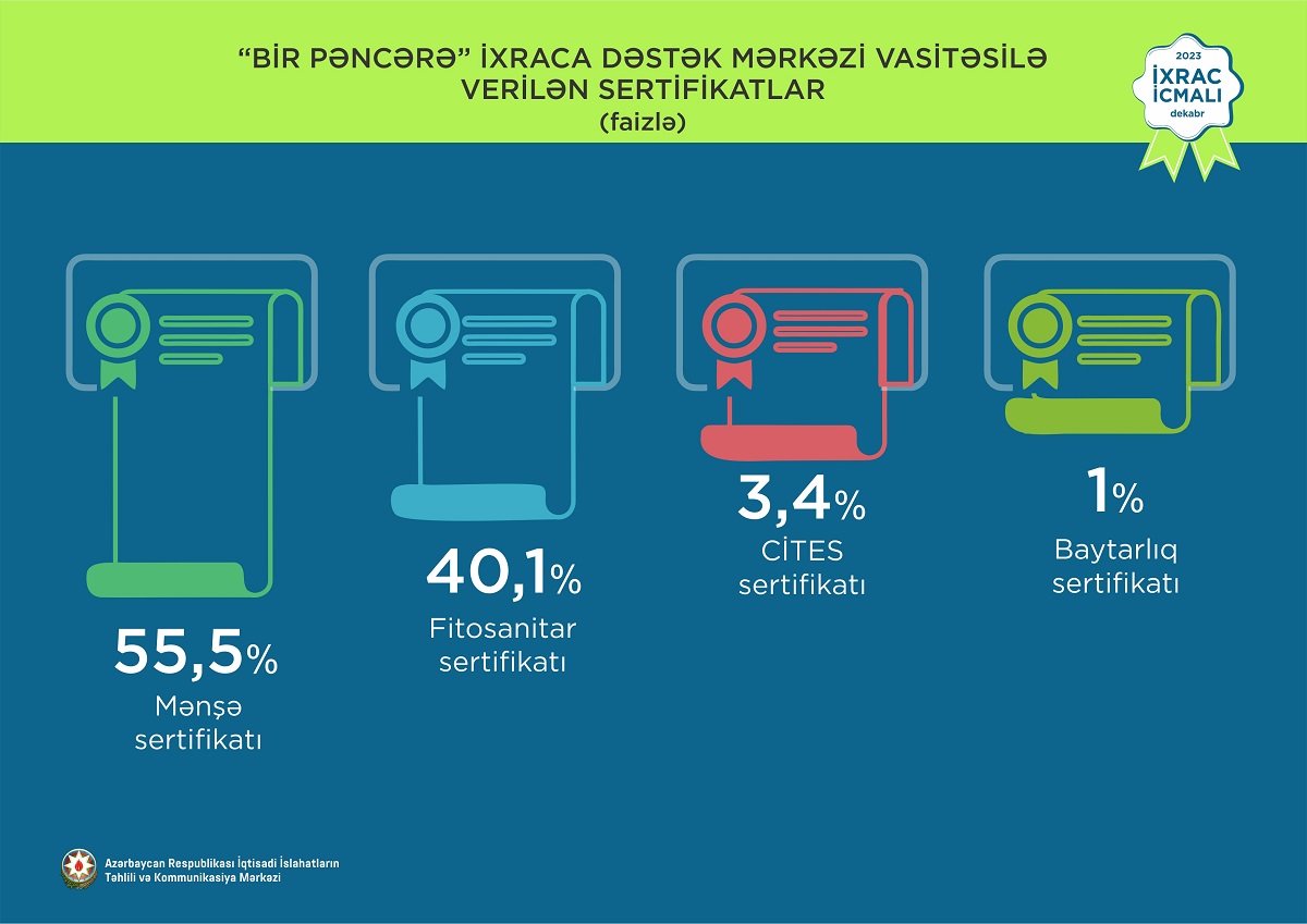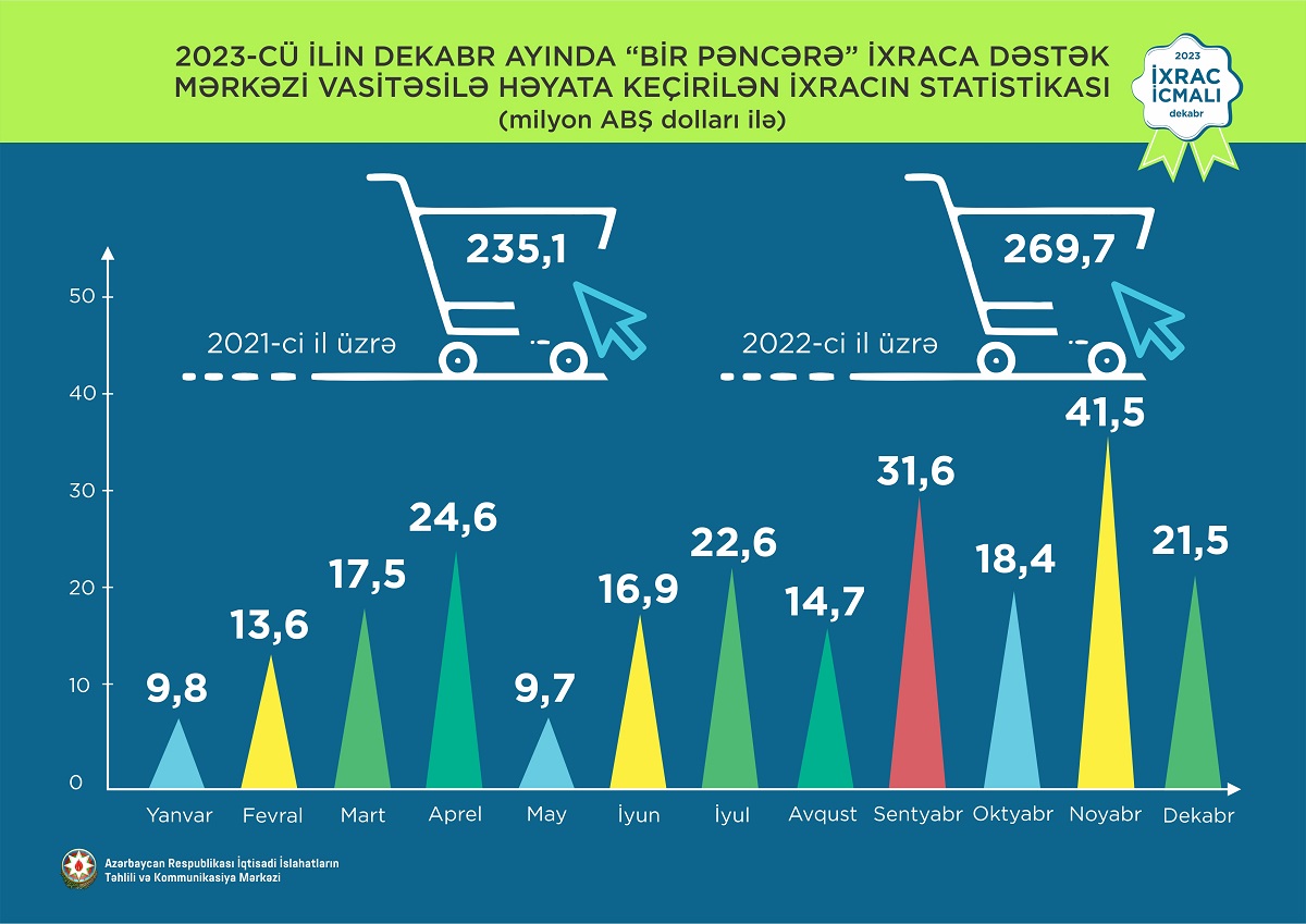 “İxrac icmalı”nda göstərilib ki, 2023-cü ilin yanvar-dekabr ayları ərzində “Bir Pəncərə” İxraca Dəstək Mərkəzi vasitəsilə həyata keçirilmiş qeyri-neft ixracının dəyəri 242,9 milyon ABŞ dolları, dekabr ayında isə 21,5 milyon ABŞ dolları olub.