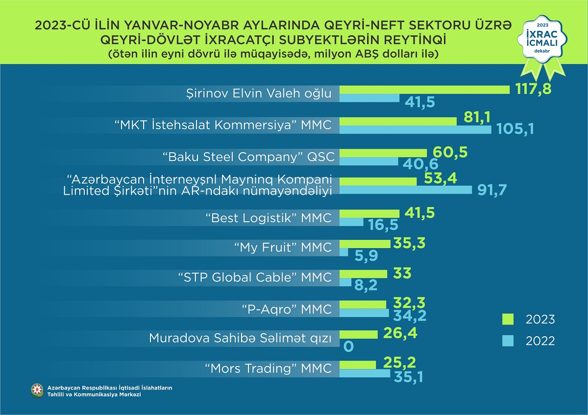 “İxrac icmalı” tərəfindən qeyri-neft sektoru üzrə 2023-cü ilin yanvar-noyabr aylarında həyata keçirilən ixracla bağlı həm qeyri-dövlət, həm də dövlətə məxsus ixracatçı subyektlərin reytinqi tərtib edilib. 11 aylıq müddət üzrə hazırlanmış qeyri-dövlət ixracatçı subyektlərin reytinqində ilk onluqda aşağıdakı şirkətlər təmsil olunurlar: Şirinov Elvin Valeh oğlu, “MKT İstehsalat Kommersiya” MMC, “Baku Steel Company” QSC, “Azərbaycan İnterneyşnl Mayninq Kompani Limited Şirkəti”nin Azərbaycan Respublikasındakı Nümayəndəliyi, “Best Logistik” MMC, “My Fruit” MMC, “STP Global Cable” MMC, “P-Aqro” MMC, Muradova Sahibə Səlimət qızı, “Mors Trading” MMC.