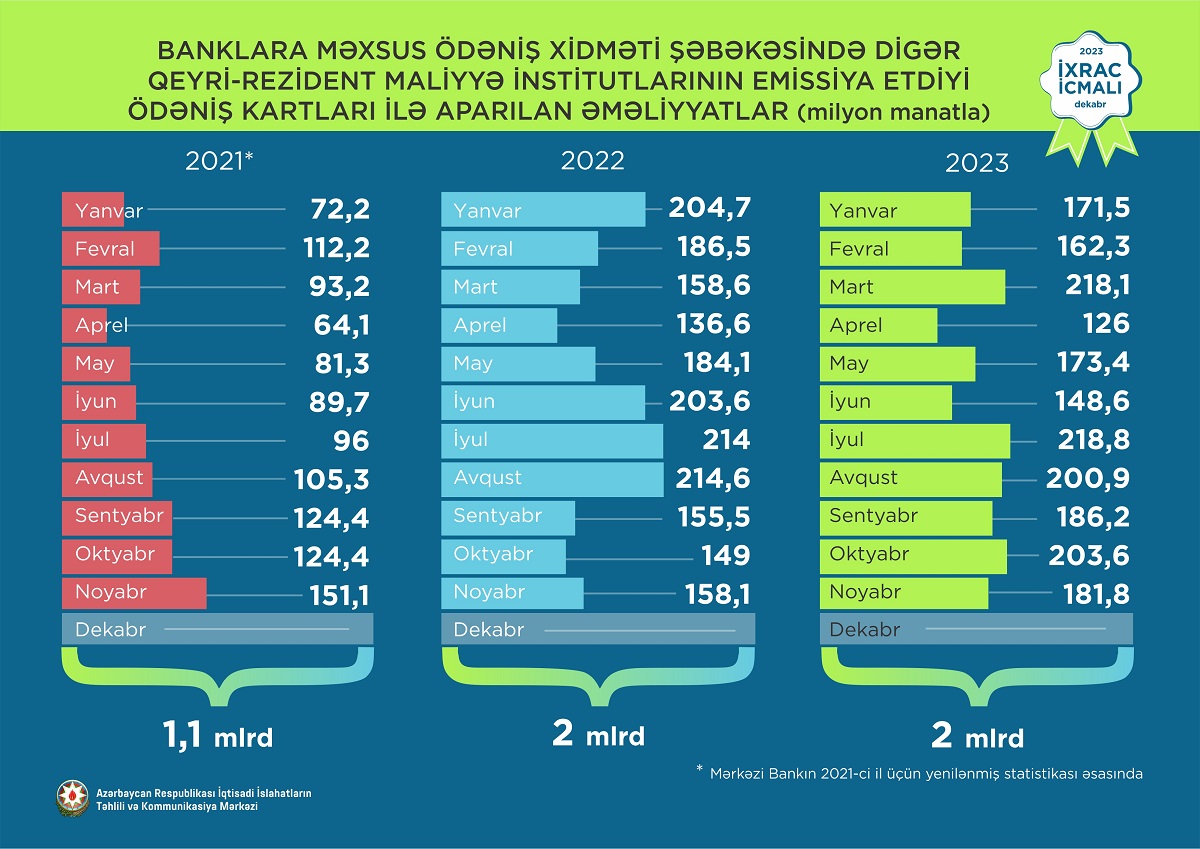 2023-cü ilin yanvar-noyabr aylarında banklara məxsus ödəniş xidməti şəbəkəsində digər qeyri-rezident maliyyə institutlarının emissiya etdiyi ödəniş kartları ilə 2 milyard manat, yalnız noyabr ayında isə 181,8 milyon manat dəyərində əməliyyat aparılıb.