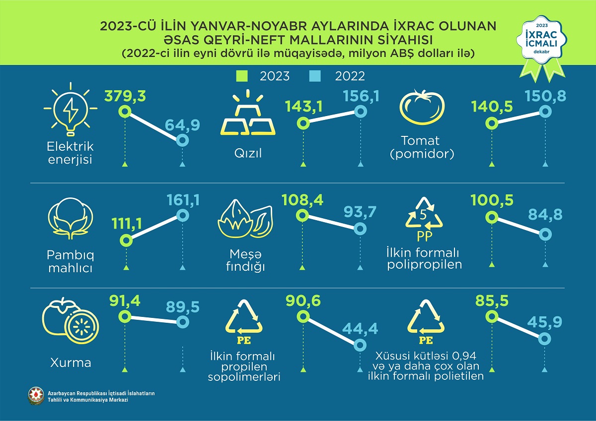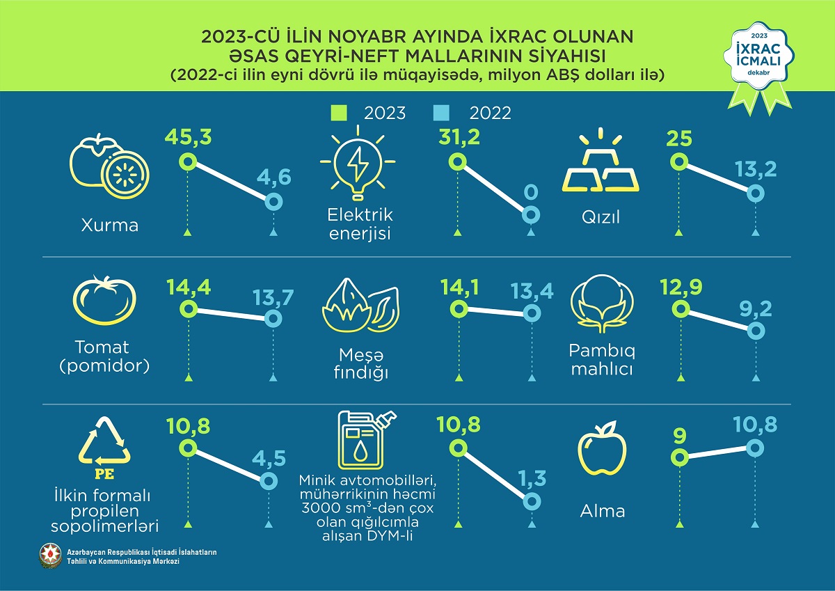 2023-cü ilin noyabr ayında ixrac edilən qeyri-neft sektoruna aid malların siyahısında xurma (45,3 milyon ABŞ dolları) birinci, elektrik enerjisi (31,2 milyon ABŞ dolları) ikinci və qızıl (25 milyon ABŞ dolları) üçüncü olub.