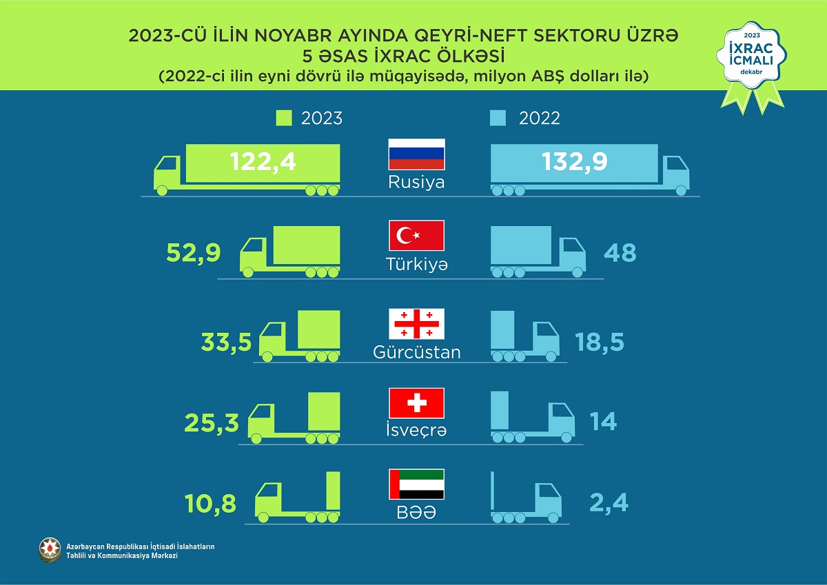 2023-cü ilin yanvar-noyabr ayları ərzində Rusiya Federasiyasına 1 milyard ABŞ dolları, Türkiyəyə 728,8 milyon ABŞ dolları, Gürcüstana 299,9 milyon ABŞ dolları, İsveçrə Konfederasiyasına 154,6 milyon ABŞ dolları, Qazaxıstana isə 89,9 milyon ABŞ dolları dəyərində qeyri-neft sektoruna aid mal ixrac olunub.