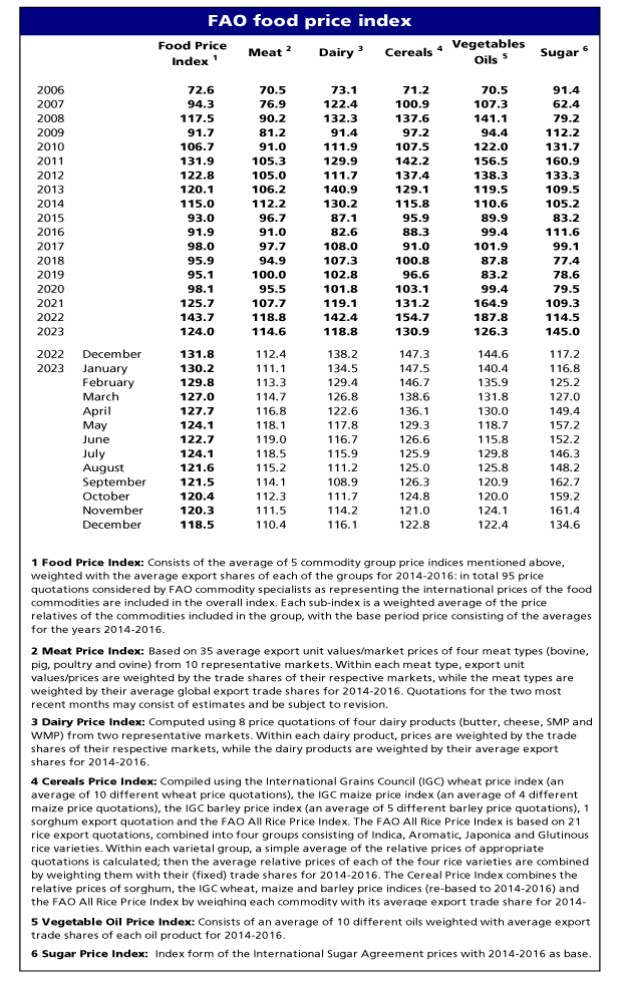 FAO-nun yaydığı açıqlamaya görə, FAO-nun Ərzaq Qiymətləri İndeksi dekabr ayında əvvəlki ayla müqayisədə 1,5 faiz, 2022-ci ilin dekabr ayı ilə müqayisədə isə 10,1 faiz azalaraq orta hesabla 118,5 bənd təşkil edib.
