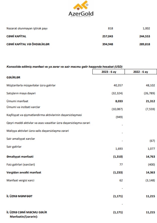 Marja.az "AzerGold" QSC-nin Konsolidə edilmiş mənfəət və ya zərər və sair məcmu gəlir haqqında hesabatına istinadən xəbər verir ki, Şirkətin gəlirləri 2022-ci ilin birinci yarısında (yanvar-iyun) 48 milyon 102 min dollar ikən, 2023-cü ilin birinci yarısında 40 milyon 357 min dollara düşüb (7 milyon 745 min dollar və ya 16,1% azalıb). Satışın maya dəyəri isə 5 milyon 535 min dollar və ya 17,1% artaraq 32 milyon 324 min dollara yüksəlib (2022-ci ilin ilk 6 ayında 26 milyon 789 min dollar təşkil etmişdi). Nəticədə, "AzerGold"un ümumi mənfəəti 2,7 dəfə azalaraq 8 milyon 33 min dollar təşkil edib (2022-ci ilin 6 ayında 21 milyon 312 min dollar təşkil etmişdi). Şirkətin ümumi və inzibati xərcləri isə 2 milyon 528 min dollar və ya 33,4% artaraq 10 milyon 87 min dollara yüksəlib.