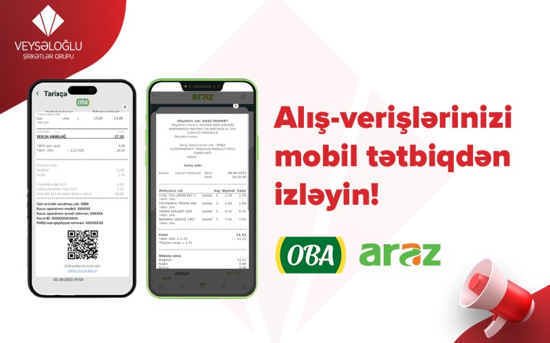 Veysəloğlu Şirkətlər Qrupuna daxil olan “Araz” və “OBA” marketlər şəbəkəslərinin müştəriləri artıq alış-veriş qəbzlərini mağazanın mobil tətbiqində də görə bilirlər.