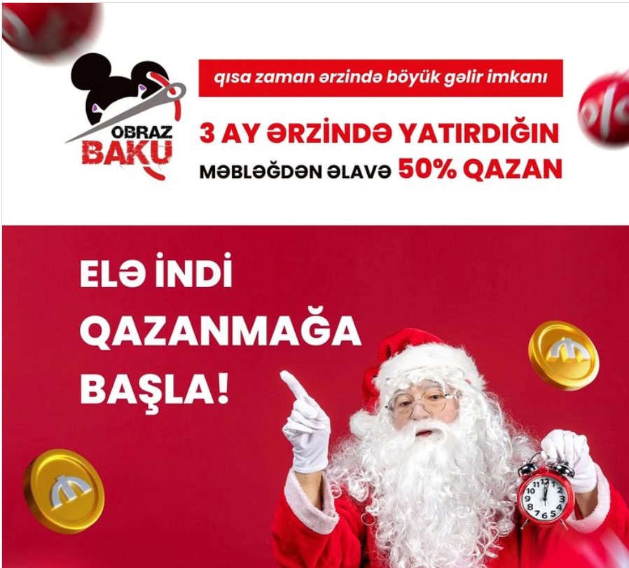 "1000 AZN-dən başlayaraq istənilən məbləğdə yatırım edib cəmi 3 ay ərzində 50% qazanc əldə edin. Belə ki, istənilən məbləğdə "Obraz Baku" məhsullarını alırsınız və daha sonra bizə icarəyə verirsiniz", -şirkətin reklamında bildirilir.