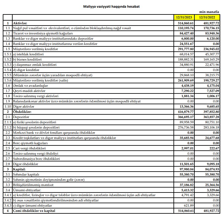 O cümlədən, Bankın istehlak kreditləri portfeli 22 milyon 707 min manat artaraq 68 milyon 14 min manata, biznes kreditləri portfeli 19 milyon 717 min manat artaraq 188 milyon 882 min manata, ipoteka kreditləri portfeli 12 milyon 409 min manat artaraq 34 milyon 881 min manata yüksəlib.