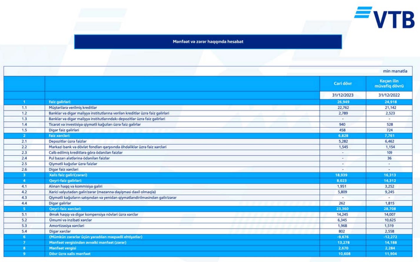 "Bank VTB (Azərbaycan)" ASC 2023-cü il üzrə maliyyə nəticələrini açıqlayıb.