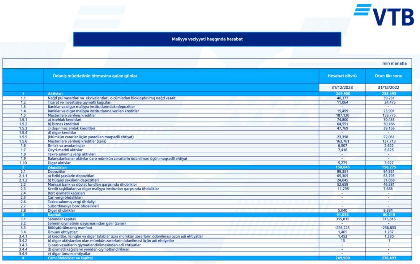 31 dekabr 2023-cü il tarixində "Bank VTB (Azərbaycan)" 83 milyon 638 min manat məcmu kapitala malik olub.