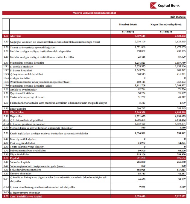 2023-cü ildə "Kapital Bank" ASC-nin cəmi aktivləri 837 milyon 446 min manat və ya 9,7% artaraq 31 dekabr 2023-cü il tarixində 8 milyard 659 milyon 618 min manata çatıb. Bank 2022-ci ilin sonunda 7 milyard 822 milyon 172 min manat cəmi aktivlərə malik idi.