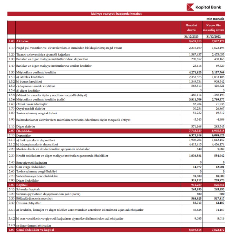 Müqayisə üçün qeyd edək ki, 2022-ci ildə "Kapital Bank"ın cəmi əməliyyat gəlirləri 1 milyard 3 milyon 289 min manat, cəmi əməliyyat xərcləri 542 milyon 827 min manat, əməliyyat mənfəəti 460 milyon 462 min manat təşkil etmişdi. Bank mümkün zərərlər üçün yaradılan məqsədli ehtiyatlara 75 milyon 153 min manat ayırmış və 77 milyon 262 min manat mənfəət vergisi ödəmişdi.
