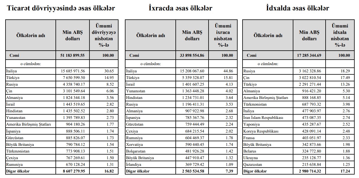 Müqayisə üçün qeyd edək ki, 2022-ci ildə Azərbaycan ilə Rusiya arasında ticarət dövriyyəsi 3 milyard 710 milyon 239 min dollar, o cümlədən ixrac 975 milyon 456 min dollar, idxal 2 milyard 734 milyon 783 min dollar, ticarət saldosu mənfi 1 milyard 759 milyon 327 min dollar olmuşdu.