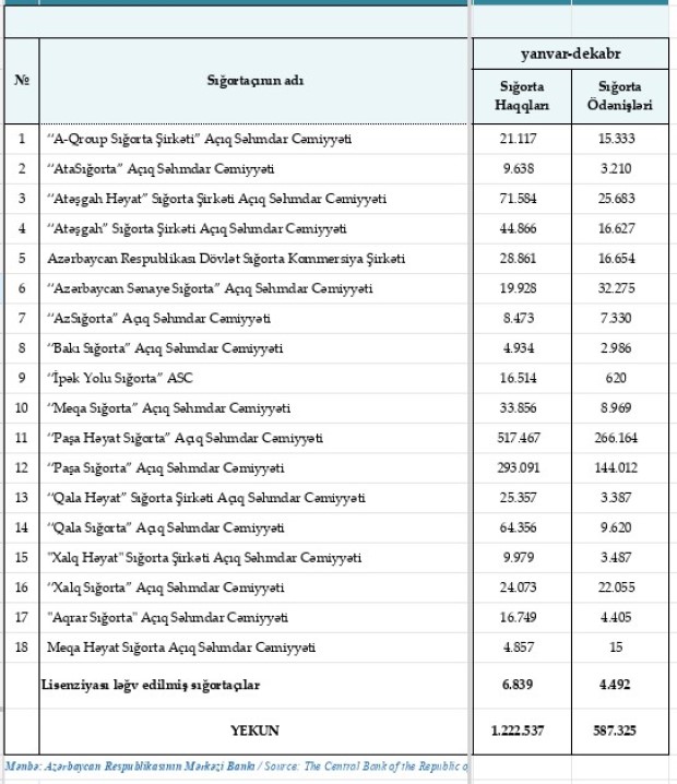 2023-cü ilin yanvar - dekabr ayları üzrə hesablanmış sığorta haqları və sığorta ödənişləri açqlanıb.