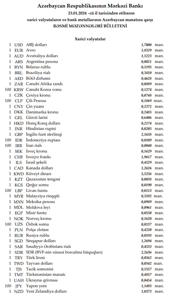 Rəsmi məzənnələr açıqlandı