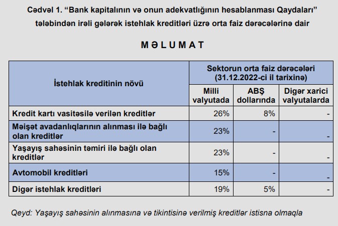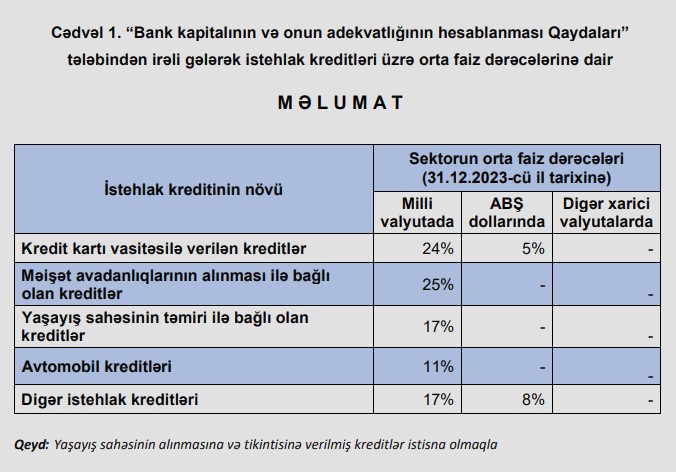 Azərbaycanda avtomobil və ev təmiri kreditləri isə ucuzlaşıb.31 dekabr 2023-cü il tarixinə Azərbaycanın bank sektorunda istehlak kreditləri üzrə orta faiz dərəcələri açıqlanıb.