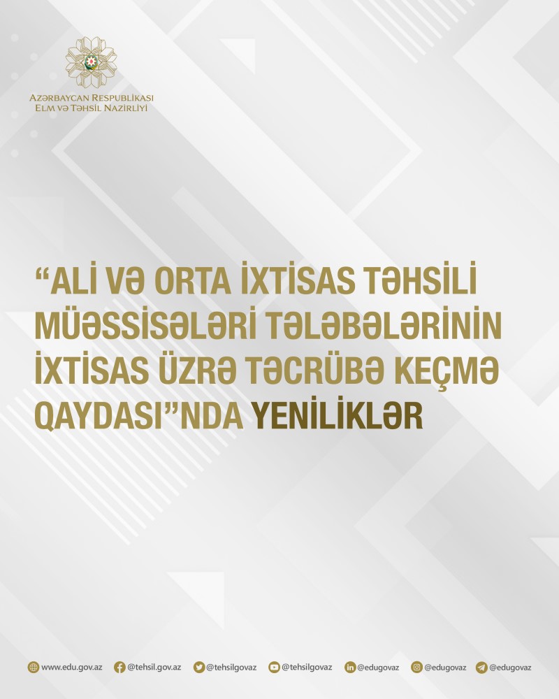 Elm və Təhsil Nazirliyindən Marja-ya verilən xəbərə görə, Yeni qaydalar 2024-cü ilin 15 sentyabr tarixindən tətbiq olunacaq. Sözügedən qaydalar xarici ölkə ali təhsil müəssisələrinin filiallarına şamil olunmur.Qaydalara əsasən, təcrübənin təşkili zamanı tədris-öyrənmə və təcrübə arasında davamlı əlaqənin qurulması, tələbənin yaradıcılıq və tədqiqat işlərində iştirakının təmin edilməsi, tələbənin müasir texnologiyalarla, iş üsulları və digər yeniliklərlə tanış edilməsi, təcrübə bazasının infrastrukturunun əlilliyi olan tələbələr üçün müyəssər olması, tələbələrin təcrübə bazasında məşğulluq imkanlarının nəzərə alınması əsas öhdəliklər kimi müəyyən olunub.