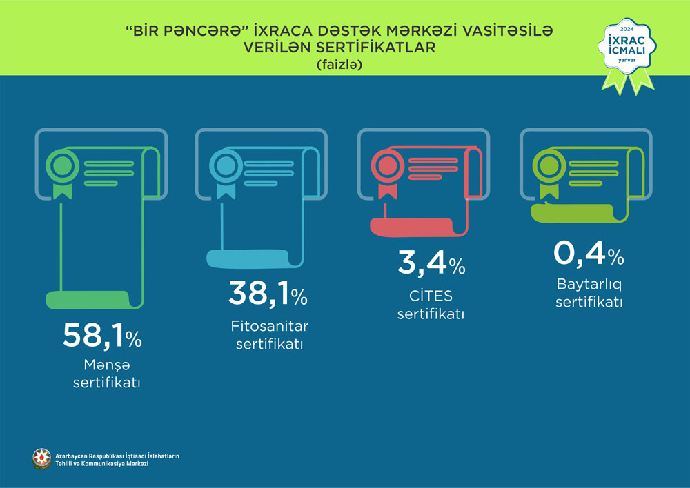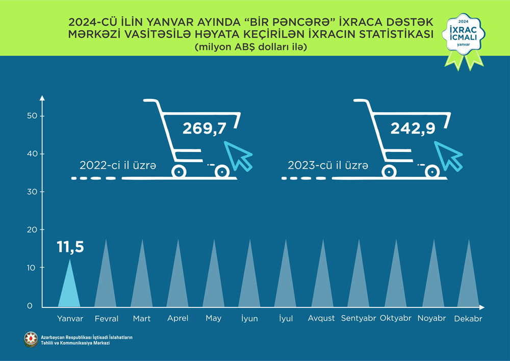 “İxrac icmalı”nda göstərilib ki, 2024-cü ilin yanvar ayı ərzində “Bir Pəncərə” İxraca Dəstək Mərkəzi vasitəsi ilə həyata keçirilən qeyri-neft ixracının dəyəri 11,5 milyon ABŞ dolları olub.