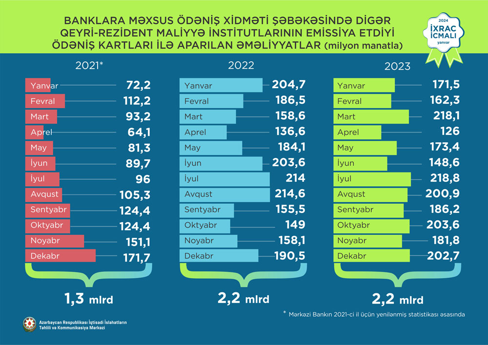 2023-cü ilin yanvar-dekabr aylarında banklara məxsus ödəniş xidməti şəbəkəsində digər qeyri-rezident maliyyə institutlarının emissiya etdiyi ödəniş kartları ilə 2,2 milyard manat, yalnız dekabr ayında isə 202,7 milyon manat dəyərində əməliyyat aparılıb.