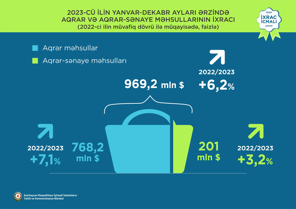 2023-cü ilin yanvar-dekabr ayları ərzində aqrar və aqrar-sənaye məhsulları üzrə birgə ixracın statistik dəyəri 6,2% artaraq 969,2 milyon ABŞ dolları təşkil edib. Qeyri-neft/qaz ixracının tərkib hissəsində əhəmiyyətli yer tutan aqrar-sənaye məhsullarının yaratdığı dəyər ötən ilin müvafiq dövrü ilə müqayisədə 3,2% artaraq 201 milyon ABŞ dolları təşkil edib.