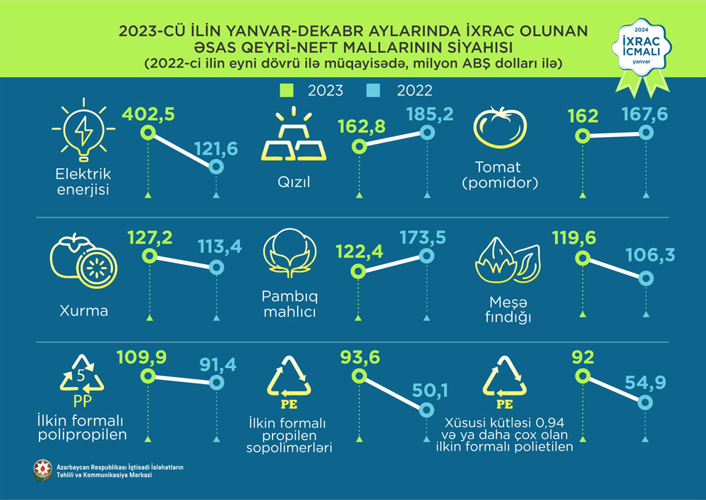 2023-cü ilin 12 ayı ərzində elektrik enerjisinin ixracı 3,3 dəfə, spirtli və spirtsiz içkilərin ixracı 1,9 dəfə, plastmas və ondan hazırlanan məmulatların ixracı 19,3%, qara metallardan məmulatların ixracı 13,3%, meyvə-tərəvəz ixracı isə 8,7% artıb.