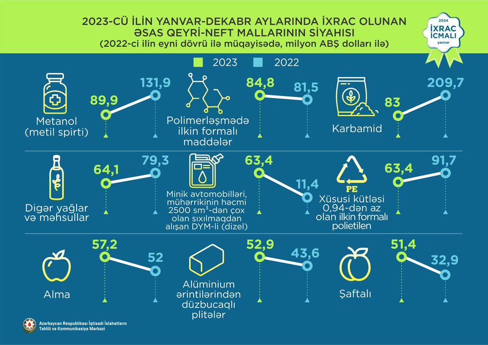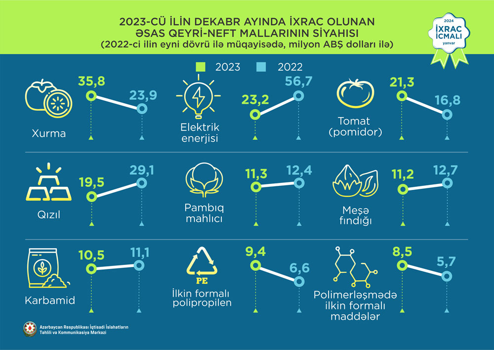 2023-cü ilin dekabr ayında ixrac edilən qeyri-neft sektoruna aid malların siyahısında xurma (35,8 milyon ABŞ dolları) birinci, elektrik enerjisi (23,2 milyon ABŞ dolları) ikinci və pomidor (tomat) (21,3 milyon ABŞ dolları) üçüncü olub.