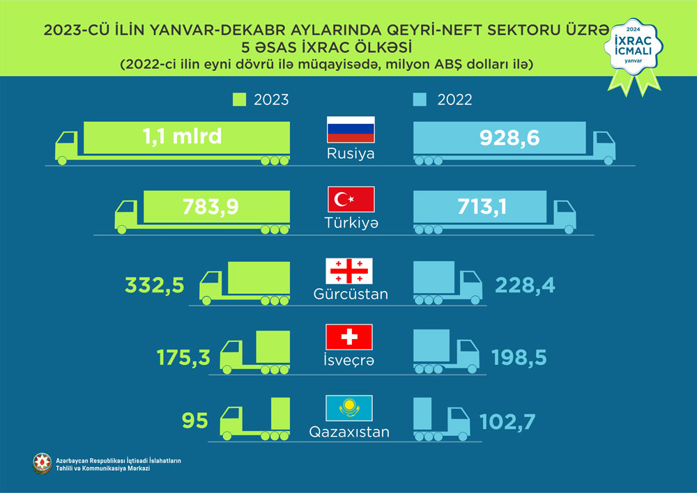 2023-cü ilin yanvar-dekabr ayları ərzində Rusiya Federasiyasına 1,1 milyard ABŞ dolları, Türkiyəyə 783,9 milyon ABŞ dolları, Gürcüstana 332,5 milyon ABŞ dolları, İsveçrə Konfederasiyasına 175,3 milyon ABŞ dolları, Qazaxıstana isə 95 milyon ABŞ dolları dəyərində qeyri-neft sektoruna aid mal ixrac olunub.