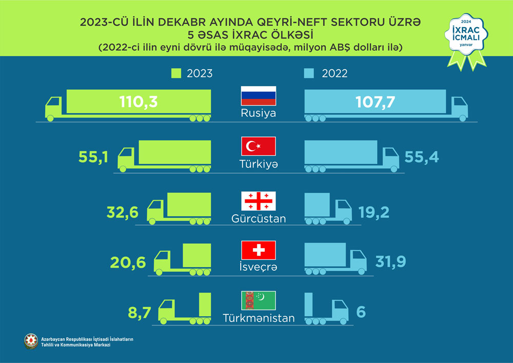 2023-cü ilin dekabr ayında qeyri-neft sektoruna aid ən çox mal ixrac edilən ölkələrin siyahısında Rusiya Federasiyası (110,3 milyon ABŞ dolları) birinciliyə yüksəlib. Bu siyahıda Türkiyə (55,1 milyon ABŞ dolları) ikinci və Gürcüstan (32,6 milyon ABŞ dolları) üçüncü olub.