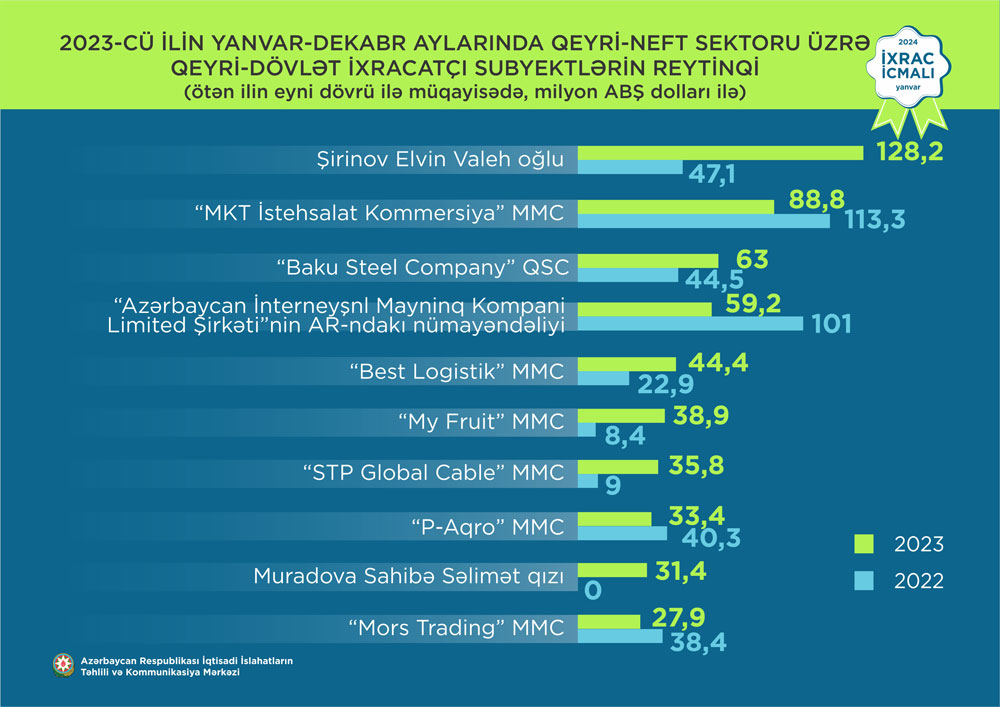 Diqqəti cəlb edən bu il qeyri-neft sektoru üzrə qeyri-dövlət ixracatçı suyektlərinin reytinqində fiziki şəxs Şirinov Elvin Valeh oğlunun 128,2 milyon dollarlıq (218 milyon manat) ixracı ilə 1-ci yeri tutmasıdır. O, 2022-ci ildə 47,1 milyon dollarlıq ixraca nail olmuşdu. Beləliklə, ötən il Elvin Şirinovun ixracı 2,7 dəfədən çox artıb.
