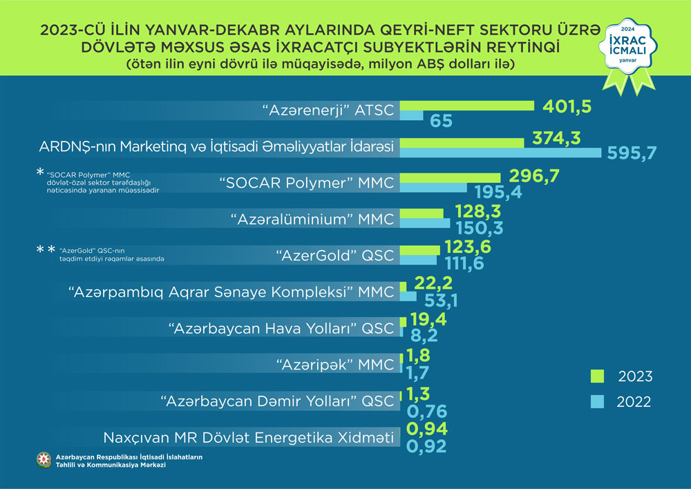 Marja.az xəbər verir ki, “İxrac icmalı” tərəfindən qeyri-neft sektoru üzrə 2023-cü ilin yanvar-dekabr aylarında həyata keçirilən ixracla bağlı həm qeyri-dövlət, həm də dövlətə məxsus ixracatçı subyektlərin reytinqi tərtib edilib.