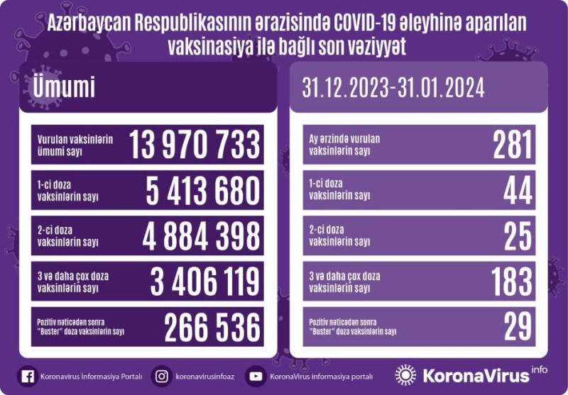 Vurulan vaksinlərin ümumi sayı 13 970 733, birinci mərhələ üzrə vaksinasiya olunanların ümumi sayı 5 413 680, ikinci mərhələ üzrə vaksinasiya olunanların sayı 4 884 398, üç və daha çox doza üzrə vaksinasiya olunanların sayı 3 406 119, pozitiv nəticədən sonra buster doza üzrə vaksinasiya olunanların sayı isə 266 536 nəfər təşkil edir.