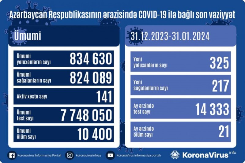 Azərbaycanda koronavirus (COVID-19) infeksiyasına son 1 ayda (31.12.2023-31.01.2024) 325 yeni yoluxma faktı qeydə alınıb, 217 nəfər müalicə olunaraq sağalıb.