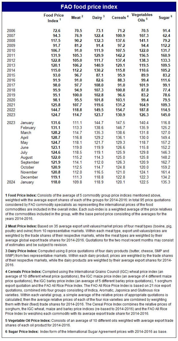 Dünya bazarında bəzi ərzaq mallarının qiymətində aylıq dəyişiklikləri ölçən FAO-nun Ərzaq Qiymətləri İndeksi yanvarda orta hesabla 118 bənd təşkil edib ki, bu da dekabrla müqayisədə 1%, bir il əvvəl ilə (Yanvar 2022) müqayisədə isə 10,4% aşağı düşüb.