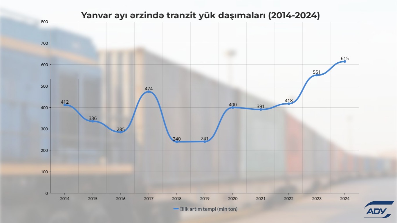 Qeyd edilib ki, 2024-cü ilin yanvar ayında 615 min ton tranzit yükü daşınıb. Bu, son 10 ilin ən yüksək göstəricisidir.