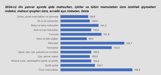 2024-cü ilin yanvar ayında qida məhsulları, içkilər və tütün məmulatları üzrə istehlak qiymətləri indeksi əvvəlki aya nisbətən 1,1 faiz artıb.