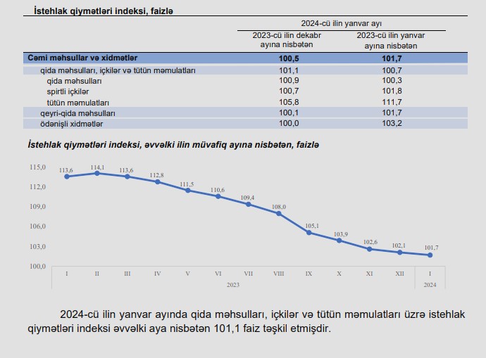 Azərbaycanda illik inflyasiya 2,1 faizdən 1,7 faizə yavaşlayıb.2024-cü ilin yanvar ayında istehlak qiymətləri indeksi (inflyasiya göstəricisi) 2023-cü ilin yanvar ayına nisbətən 1,7 faiz, o cümlədən qida məhsulları, içkilər və tütün məmulatları üzrə 0,7 faiz, qeyri-qida məhsulları üzrə 1,7 faiz, əhaliyə göstərilmiş ödənişli xidmətlər üzrə 3,2 faiz artıb.