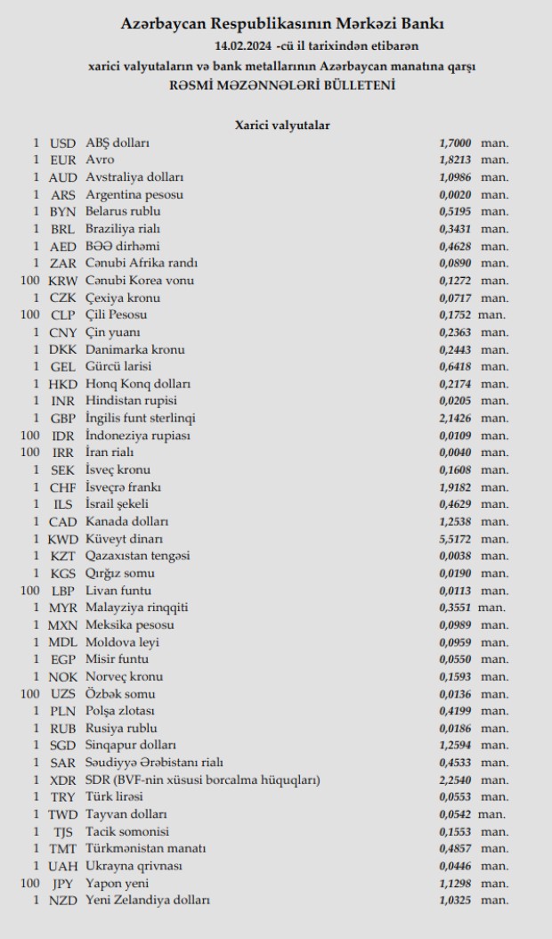 Rəsmi məzənnələr açıqlandı