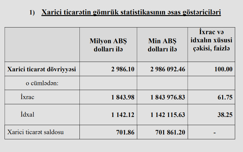 Marja.az Dövlət Gömrük Komitəsinə istinadən xəbər verir ki, o cümlədən ixrac 1 milyard 843 milyon 977 min ABŞ dolları, idxal 1 milyard 142 milyon 116 min ABŞ dolları təşkil edib. Nəticədə ticarət saldosu 701 milyon 861 min ABŞ dolları olub.