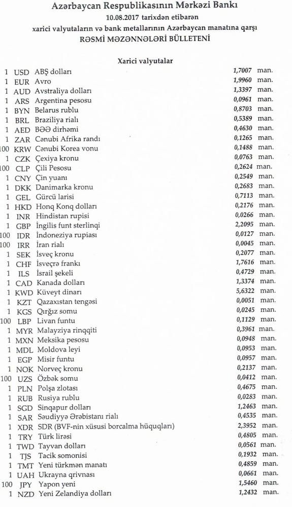 Avqustun 10-na Mərkəzi Bankın açıqladığı rəsmi Dollar/manat məzənnəsi Avqustun 9-u ilə müqayisədə dəyişməyərək 1,7007 manat olub, Avro/manat məzənnəsi isə 1.9960 manata düşüb.