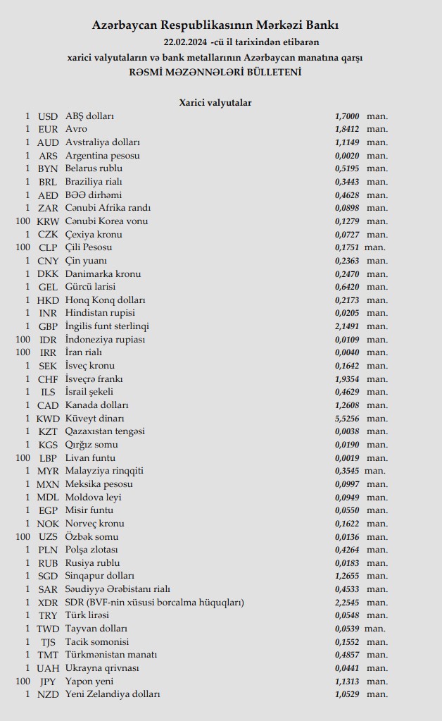 Dolların bazar ertəsi üçün rəsmi məzənnəsi müəyyən olunub