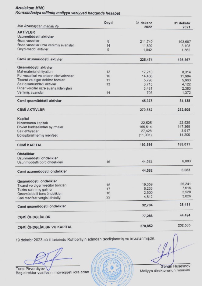 2022-ci ilin zərəri ilə əlaqədar olaraq "Aztelekom" şirkətinin 2021-ci ilin sonunda 14 milyon 200 min manat təşkil etmiş bölüşdürülməmiş mənfəəti 11 milyon 901 min manat yığılmış zərər ilə əvəzlənib.