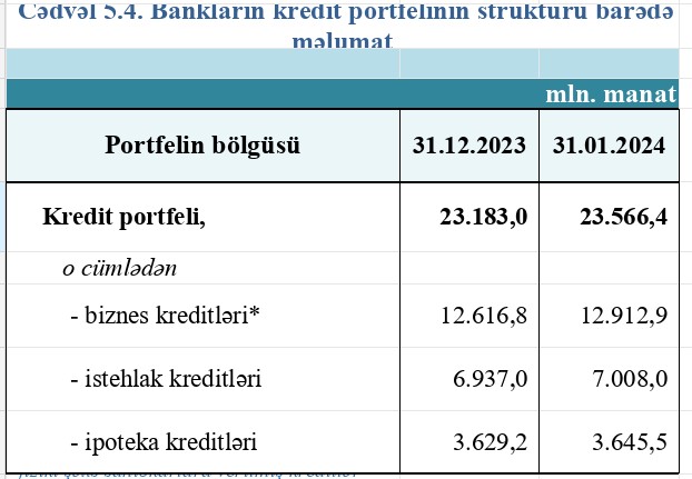 2024-cü ilin Yanvar ayında Azərbaycan banklarının kredit portfelinin (müştərilərə verilmiş kreditlər) artmasına ən böyük töhfəni biznes kreditlərindəki artım verib.