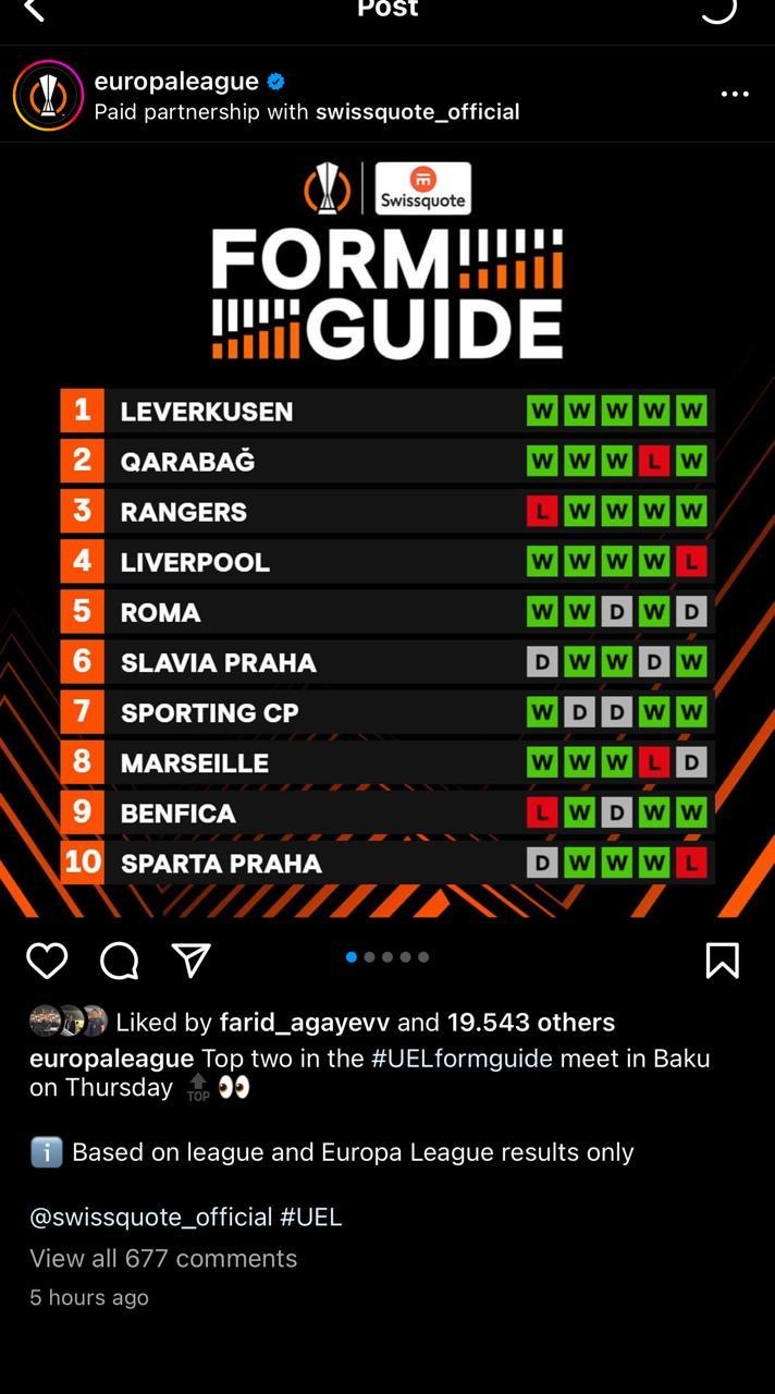Paylaşımda bu mövsüm ölkə çempionatında və Avropa Liqasında ümumilikdə son 5 matçda ən yaxşı nəticələr əldə edən komandalar yer alıb. Leverkuzen təmsilçisi 5 oyundan 5 qələbə ilə siyahının ilk pilləsində qərarlaşıb. “Qarabağ” 5 oyundan 4 qələbə və 1 məğlubiyyətlə 2-ci pillədə yer alıb.