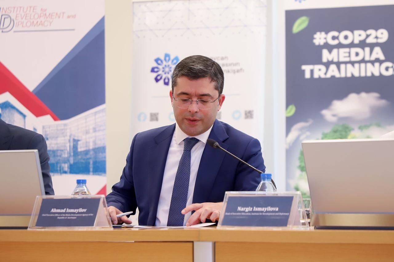 Təlimin açılış mərasimində çıxış edən Medianın İnkişafı Agentliyinin İcraçı direktoru Əhməd İsmayılov ekoloji məsələlərin ümumbəşəri əhəmiyyət kəsb etdiyini vurğulayaraq bu istiqamətdə peşəkar medianın üzərinə ciddi məsuliyyət düşdüyünü bildirmiş, medianın ilk növbədə ekoloji maarifləndirməyə böyük diqqət göstərməli olduğunu, həmçinin insanların ekoloji savada yiyələnməsinin təşviqində oynadığı müstəsna rolu qeyd etmişdir. İcraçı direktor həmçinin diqqətə çatdırmışdır ki, Azərbaycan mediası COP29-un yaratdığı imkanlardan faydalanaraq bu istiqamətdə işini səmərəli mexanizmlər əsasında qurmalı, öz subyektiv mülahizələrini əsas götürərək ölkəmizin imicini ləkələmək istəyənlərə tutarlı arqumetlərlə cavab verməlidir.