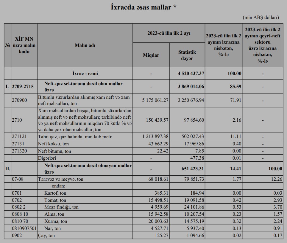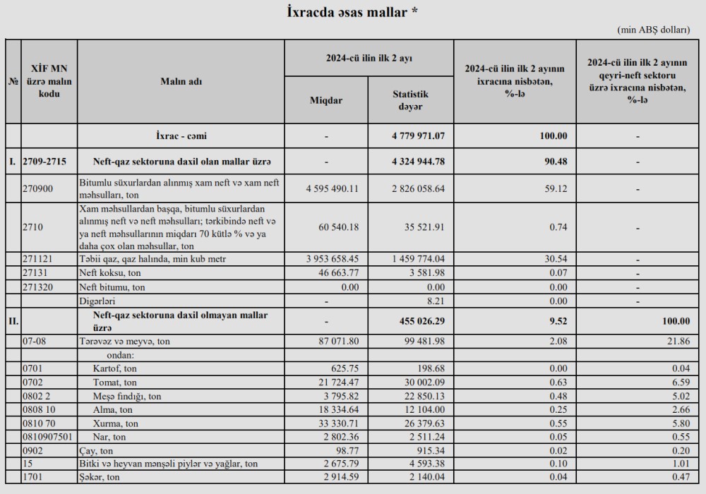 2024-cü ilin ilk 2 ayı ərzində neft-qaz sektoruna daxil olan mallar üzrə ixracının 2 milyard 826 milyon 58 min dollarını xam neft, 1 milyard 459 milyon 774 min dollarını təbii qaz təşkil edib.