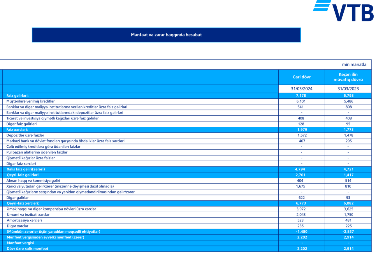 "Bank VTB (Azərbaycan)" ASC 2024-cü ilin 1-ci rübünü (yanvar-mart) 2 milyon 202 min manat xalis mənfəət ilə başa vurub.