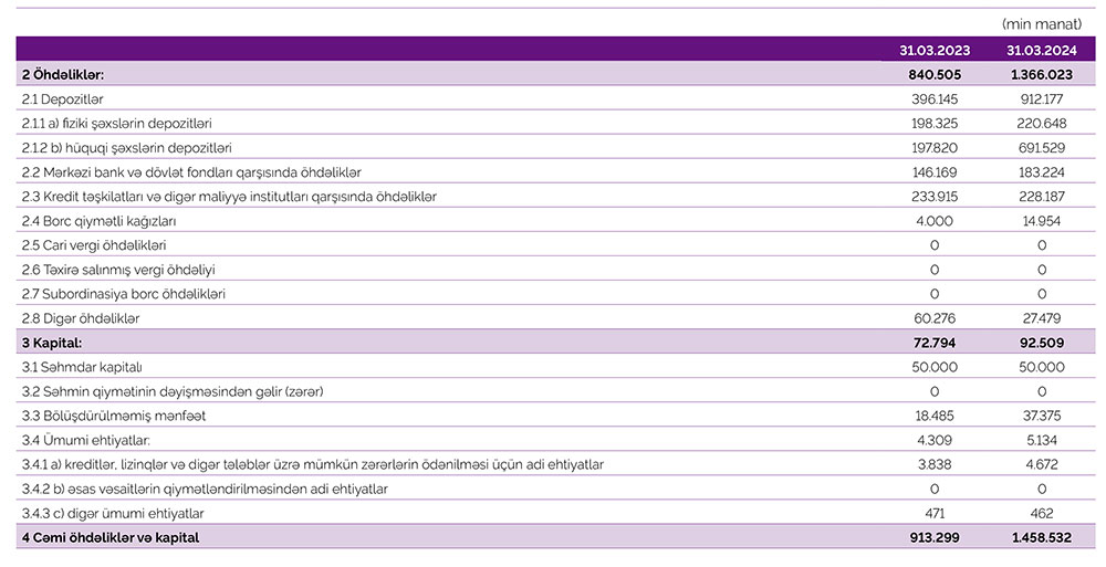 Cəmi bank öhdəliklərinin həcmi 1,4 milyard manat səviyyəsindədir.