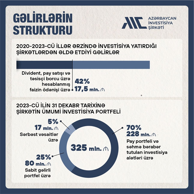 Qeyd edilib ki, gəlirlərin strukturuna baxdıqda, şirkətin 2020-2023-cü illər ərzində gəlirlərinin 42%-i (17.5 milyon manat) investisiya yatırdığı şirkətlərdən əldə etdiyi dividend, pay satışı və təsisçi borcu üzrə hesablanmış faizin ödənişindən formalaşıb.