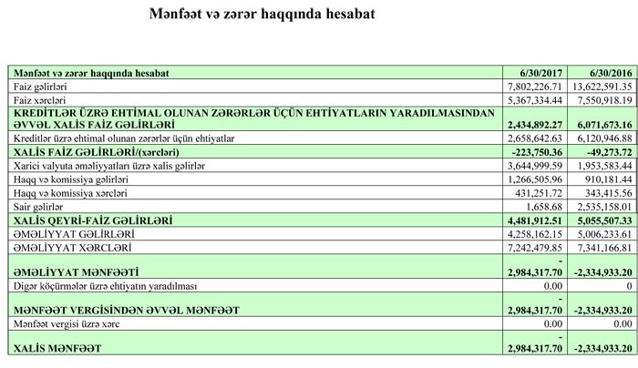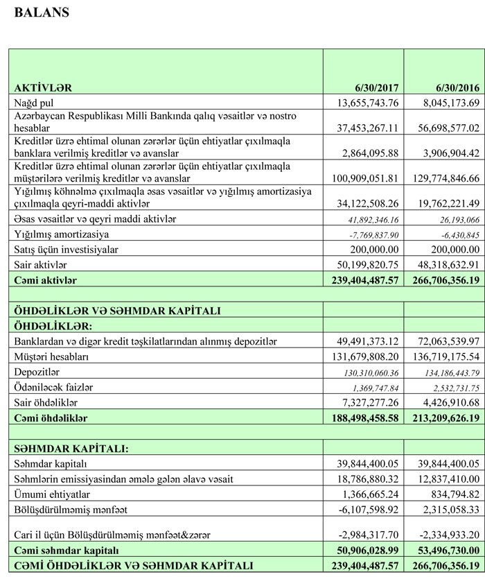 Bankın müştərilərə verdiyi kreditlər 101 milyon manata yaxın olub, bu məbləğ ötən ilin İyununda 129 milyon manat civarında idi.
