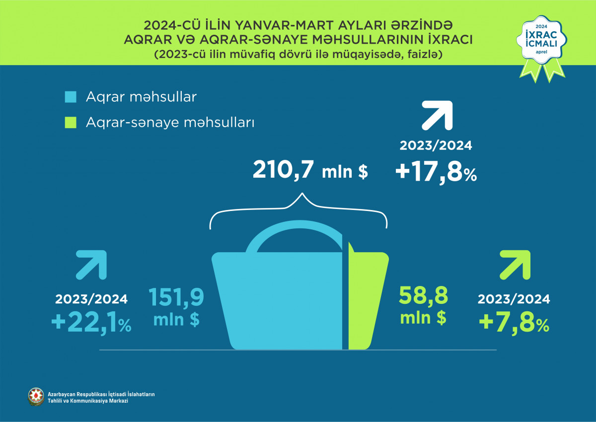2024-cü ilin ilk rübü ərzində aqrar və aqrar-sənaye məhsulları üzrə birgə ixracın statistik dəyəri 17,8% artaraq 210,7 milyon ABŞ dolları təşkil edib. Qeyri-neft/qaz ixracının tərkib hissəsində əhəmiyyətli yer tutan aqrar-sənaye məhsullarının yaratdığı dəyər 7,8% artaraq 58,8 milyon ABŞ dolları olub.